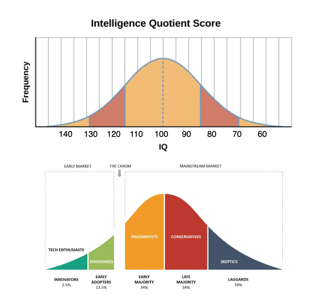 But enterprise software technology adoption, as we have seen before, is driven by an adoption-cycle Bell curve that — according to me — correlates with the IQ of the buyer population. That is, the smarter people will quickly foresee and extrapolate the capabilities of the product and find ways to use it in the organisation. Those who are behind in the IQ queue will wait for a greater force to be applied on them to knock them out of their restful inertia. That greater force is usually applied via top class marketing.